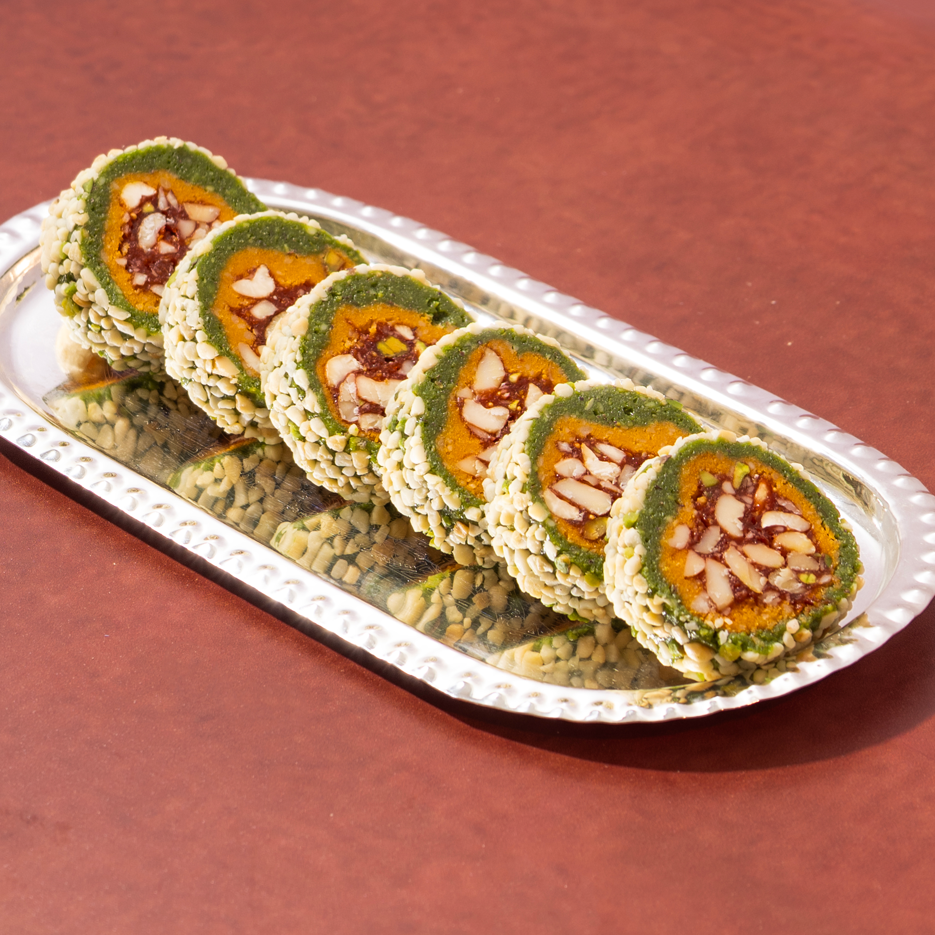 DF Anjeer Pista Chakra is a premium dry fruit mithai made with the sweetness of figs, layered with crunchy pistachios and rich assorted nuts. Crafted in an elegant spiral shape, it offers a perfect balance of soft, chewy texture and nutty richness. Wholesome, flavorful, and visually striking, this mithai is an excellent choice for festive indulgence and premium gifting.
