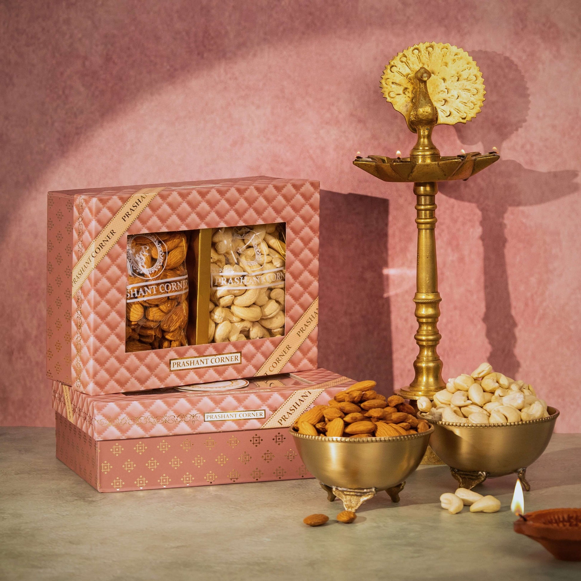 Savor the wholesome goodness of our Premium Dry Fruit Gift Box. A curated selection of handpicked almonds and cashews, roasted to perfection for an indulgent crunch. Packed in an elegant, quilted box, this offering combines purity, taste, and tradition in every bite. Perfect for festive gifting or sharing moments of joy, it’s a tasteful expression of warmth and celebration.