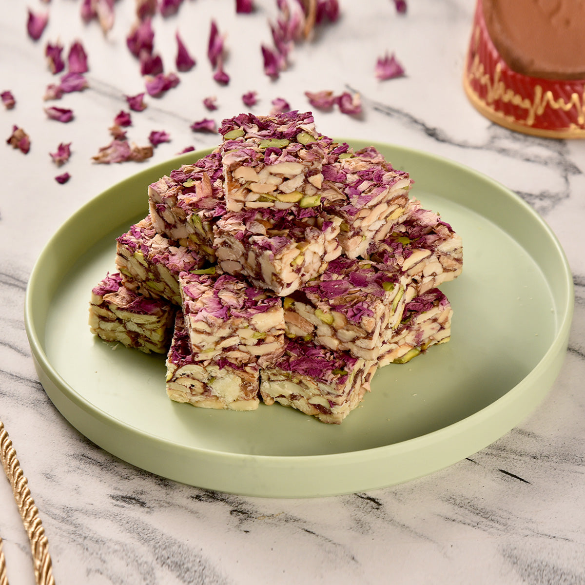 Experience the delicate and floral flavors of DF Rose Sugerless. This sugar-free treat is a combination of dried fruits like almonds, cashews, pistachios, and raisins, infused with the essence of rose. Enjoy the aromatic and guilt-free indulgence of this unique sweet.