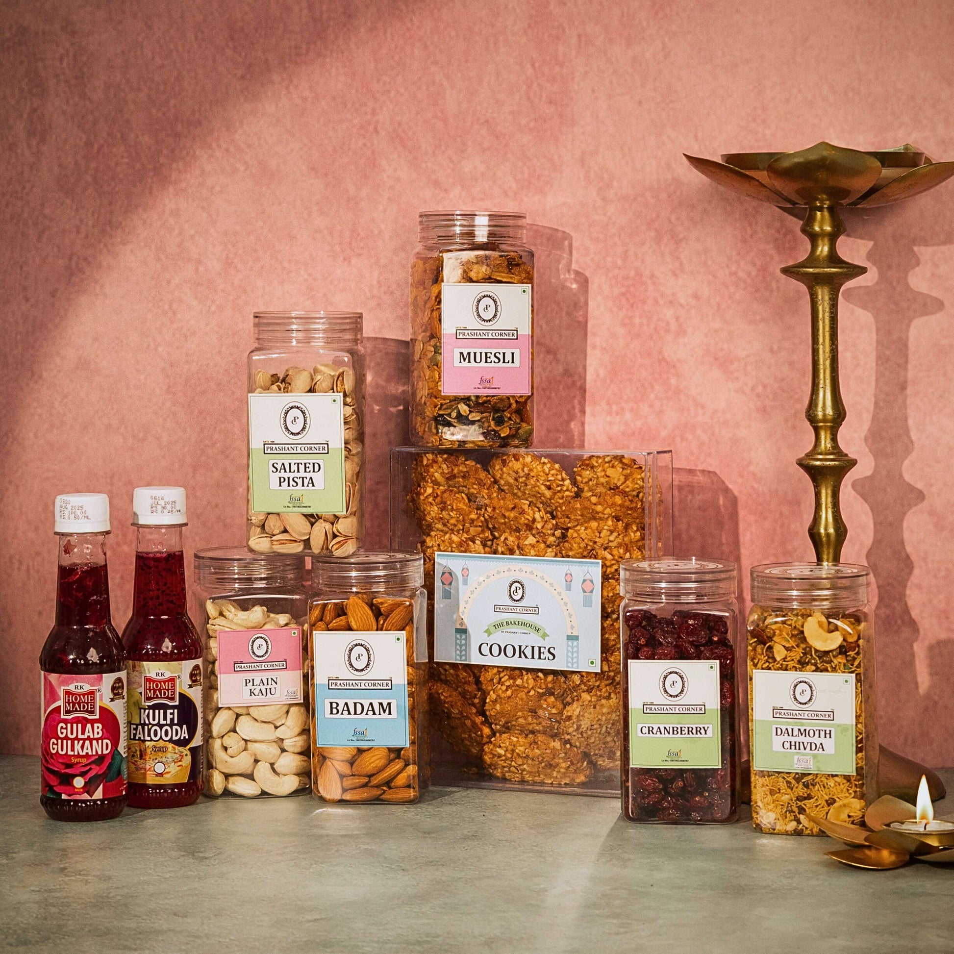 Celebrate life’s special moments with our Gourmet Hamper, a luxurious assortment of our finest treats. Thoughtfully curated with premium dry fruits, wholesome muesli, flavourful cookies, spiced chivda, tangy cranberries, and signature syrups, this hamper brings together indulgence and tradition in perfect harmony. Elegantly packed with festive detailing, it makes for a timeless gift of warmth, taste, and togetherness.