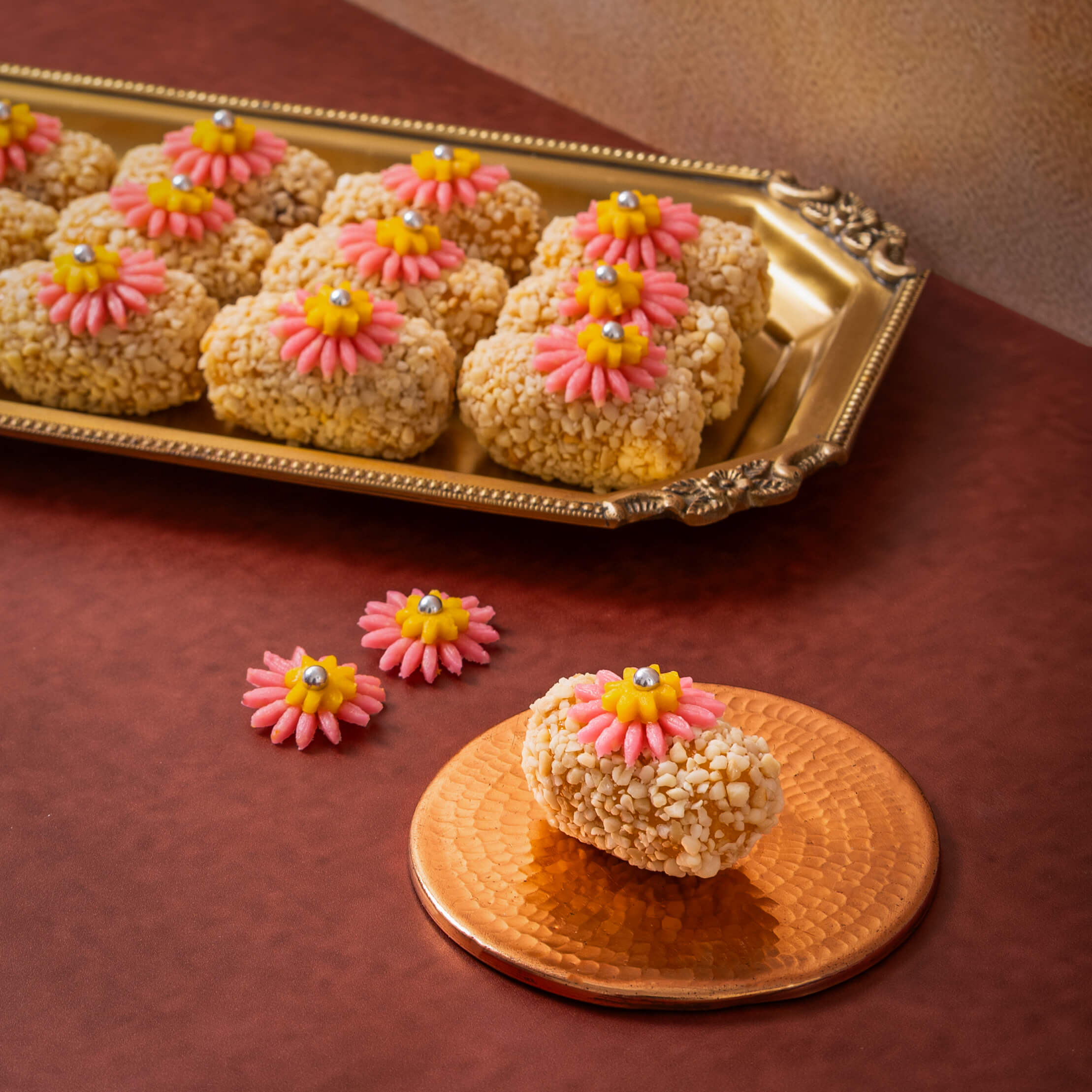 Mango Roll is a delicious mithai filled with the sweetness of mango and coated with crunchy nuts for the perfect balance of taste and texture. Decorated with a delicate flower motif on top, it looks as beautiful as it tastes. Soft, nutty, and rich in flavour, it’s an elegant treat that adds a touch of joy to every celebration.