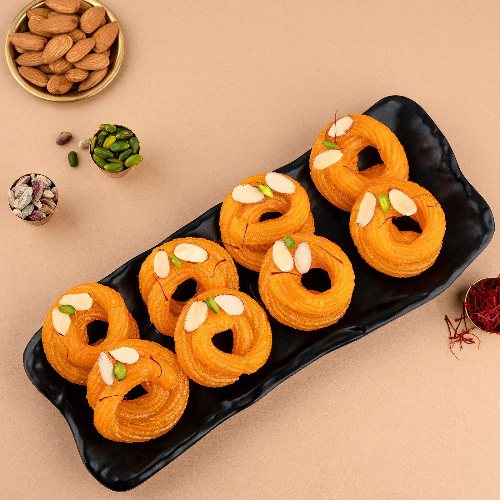Indulge in the unique and delightful Paneer Jilebi. Made with a twist, this sweet treat combines the richness of paneer (Indian cottage cheese) with the classic jilebi. The paneer is blended into a smooth batter, deep-fried to a golden perfection, and soaked in a luscious sugar syrup. Savor the creamy and melt-in-your-mouth goodness of Paneer Jilebi, a truly heavenly dessert.